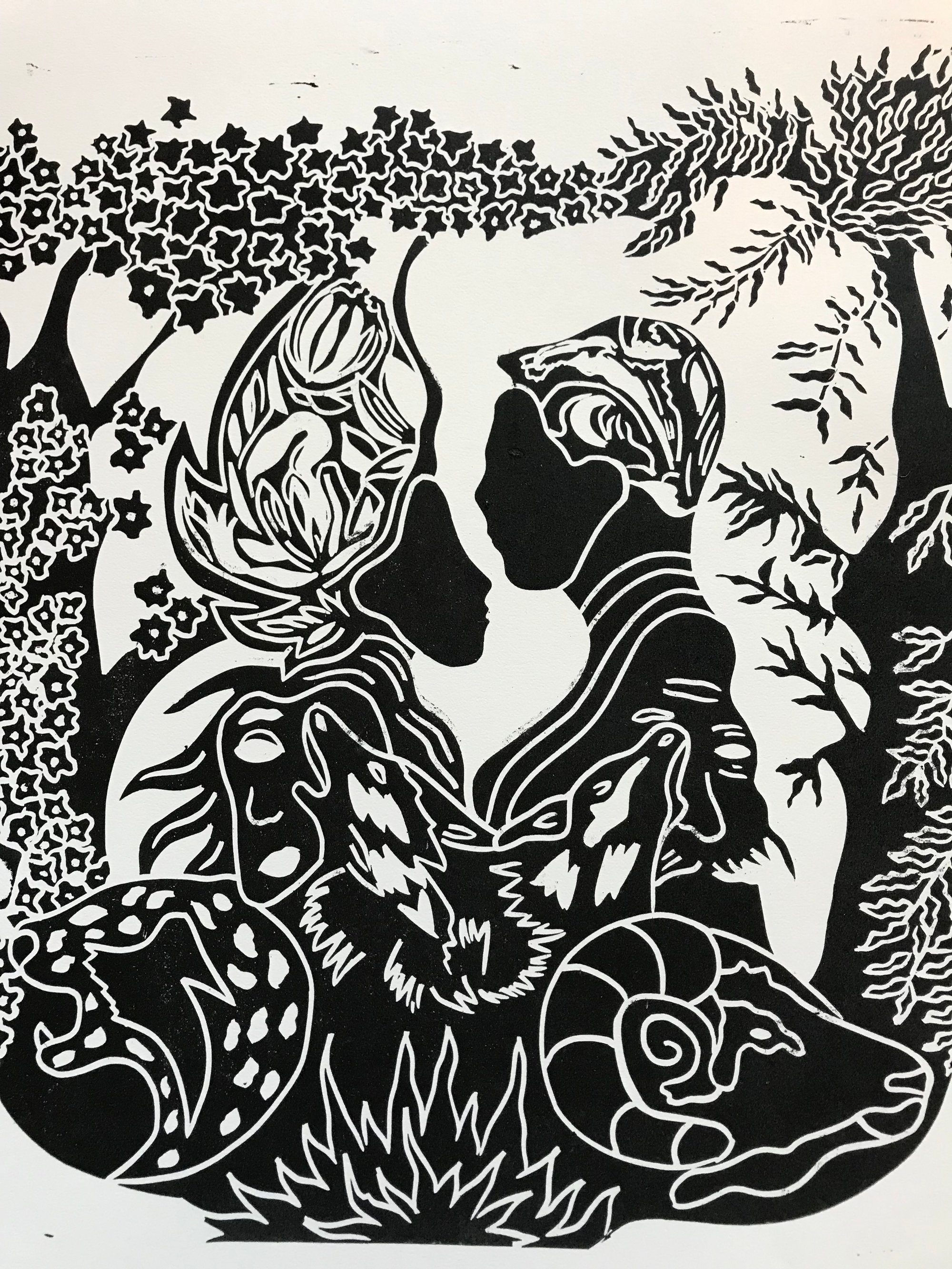 This linocut is 12 by 12 inches. It is one of six printed art pieces made with oil based ink on 22x30 inch Stonehenge 250 gsm paper.