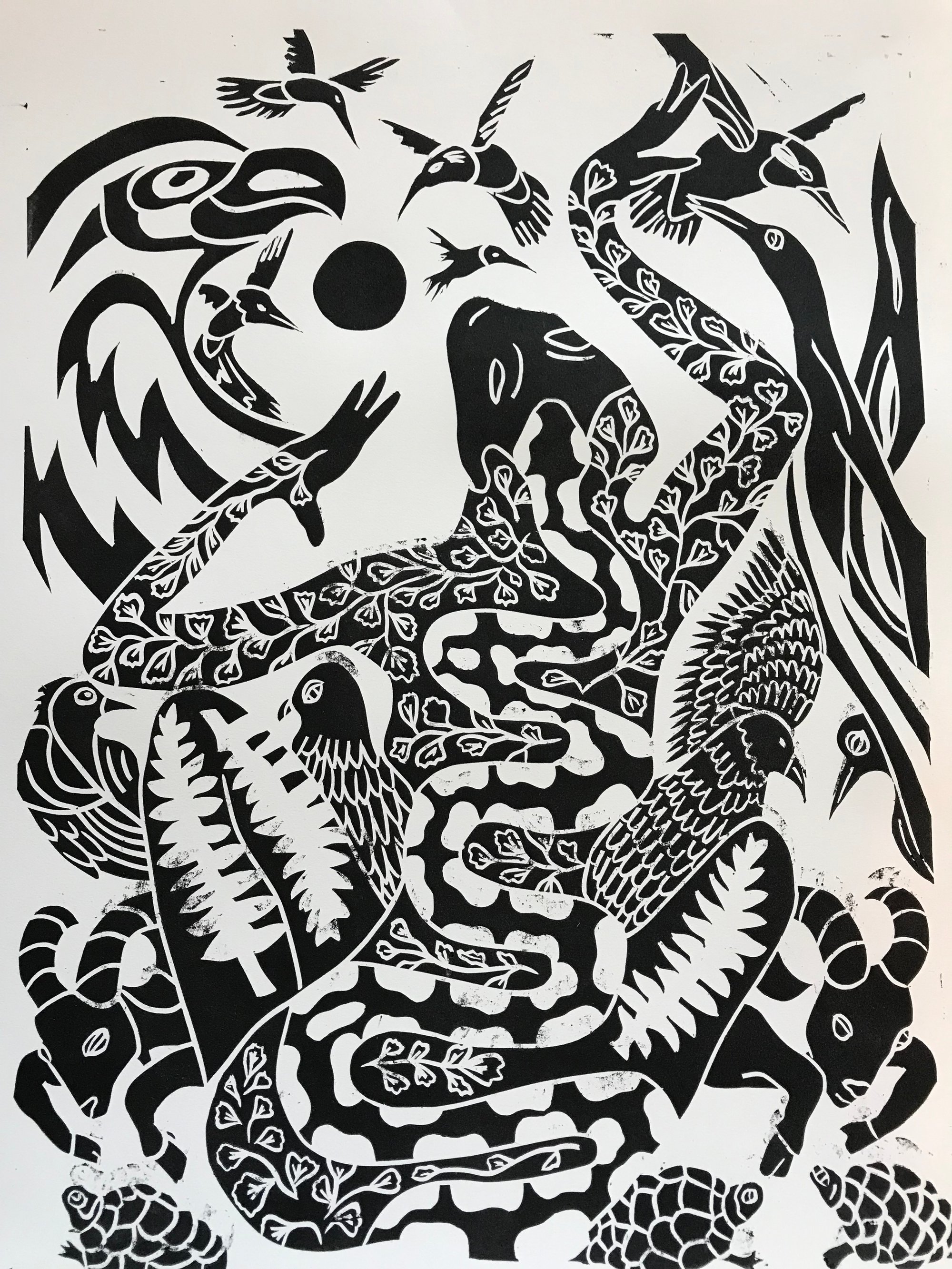 This linocut is 11 by 15 inches. It is one of six printed art pieces made with oil based ink on 22x30 inch Stonehenge 250 gsm paper.